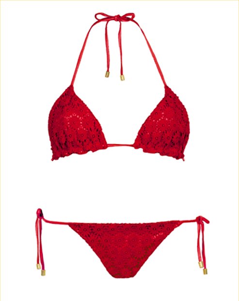 Cette collection se compose de 4 lignes dont le Bikini imprimé pomme et le Bikini Guipure, tous les 2 réversibles, une micro maille laquée rouge au dessous de l’imprimé ou de la broderie pour une plus grande variété de looks.